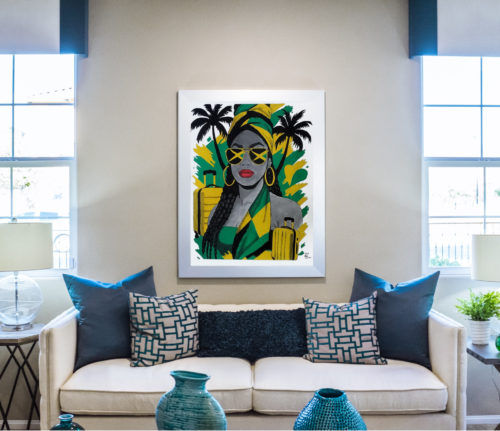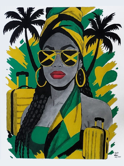 Hyperrealism drawing of a confident Black woman in Jamaica-inspired colors. Her headwrap, sunglasses, and attire glowing in green, gold, and black. Estimated completion time is 17 hours.